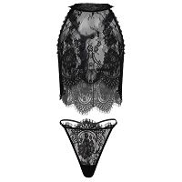 Koszulka została wykonana z delikatnej, czarnej koronki, która niczym delikatna mgiełka otuli Twoje ciało. Na plecach znajduje się rozbudzające wyobraźnię wycięcie oraz wiązanie, dzięki któremu jednym ruchem odsłonisz swoje spragnione rozkoszy piersi.