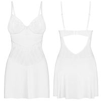 Biała koszulka nocna i stringi z delikatnego materiału. Subtelny, zmysłowy zestaw o klasycznym fasonie. Doskonale podkreśli Twoje atuty, przyjemnie otuli biodra, podkreślając wcięcie w talii, manifestując kobiecość nie tylko podczas romantycznych spotkań. Daj się zaskoczyć przyjemnym połączeniem najwyższej jakości materiałów, które otulą Cię delikatnością i komfortem.