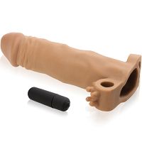Wydłuża aż o 5 cm! Unikatowa nakładka na penisa posiada dodatkowy silniczek wibrujący, który możesz włożyć w końcówkę z wypustkami masującymi. Zagwarantuje to Twojej kochance niebiańskie doznania. Kiedy będziesz pieścił jej pochwę większym i grubszym penisem, nakładka zaopiekuje się jej złaknioną łechtaczką. Przedłużka wykonana z cyberskóry jest niezwykle gładka i przyjemna w dotyku. Ponadto zapewnia w ten sposób realistyczne wrażenia, które potęgowane są również naturalnymi uwypukleniami i żyłkami. Nakłada zawiera także obręcz, którą możesz nałożyć na jądra i cieszyć się nieopisanymi uczuciami oraz dłuższym stosunkiem. Poznaj nową jakość seksu, daj swojej partnerce to, o czym zawrze marzyła i wybierz wyjątkową, wielofunkcyjną nakładkę.