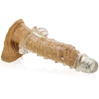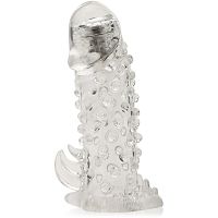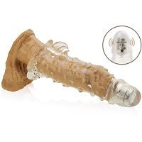 Nakładka stymulująca wykonana z elastycznego, krystalicznego żelu, dzięki czemu idealnie dopasowuje się do każdego członka. Nakładka skutecznie może zwiększyć erekcje, czas trwania stosunku oraz pomaga powstrzymać przedwczesny wytrysk. Można ją łatwo rozciągnąć zarówno wzdłuż i wszerz. Nakładka posiada na całej swojej powierzchni setki mocno wyczuwalnych wypustek, oraz języczki mocno stymulujące łechtaczkę partnerki podczas penetracji. Największą zaletą nakładki jest pełna końcówka, która nie dość, że zwiększy długość penisa to dodatkowo posiada dotykowy mechanizm wibracyjny. Fala wibracji rozpłynie się z każdym pchnięciem i naciskiem na końcówkę. Poznajcie wspólnie nowy rodzaj orgazmu!