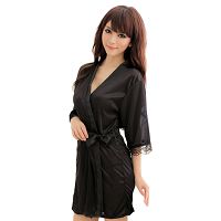 Seksowny szlafrok wykonany z delikatnej satyny. Przyjemny w dotyku materiał subtelnie otula ciało i podkreśla jego atuty. Brzeżki rękawów wykończone są niezwykle kobiecą gipiurą. W komplecie wraz z kuszącymi stringami.