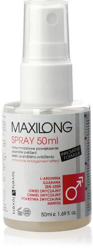 MAXILONG SPRAY 50ML- to płyn intymny z efektem natychmiastowego powiększenia penisa. Jako jedyny posiada L-argininę, która pobudza mikrokrążenie w skórze zwiększając napływ krwi do tkanek członka oraz pomaga zoptymalizować przyswajanie pozostałych składników. Unikalne na skalę Europy połączenie składników aktywnych (m.in. L-arginina, Żeń-szeń, Avena sativa L, Humulus Lupulus L, Urtica dioica L, mentol) wzmacnia erekcję, a poprzez wzmożony napływ krwi do tkanek, zwiększa rozmiar (długość i obwód) męskiego członka. Dodatek guarany działa pobudzająco i stymulująco.