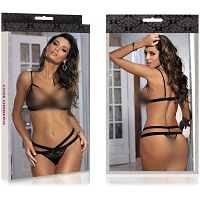 Zestaw bielizny damskiej wykonany w całości z koronkowego materiału. Seksowny biustonosz posiada dodatkowe, biegnące przez biust na skos paski, które rozkosznie podkreślają piersi. Stanik ma regulowane ramiączka i obwód oraz umieszczoną od spodu gumkę, która podtrzymuje biust. Ponętne stringi nie opinają, dzięki czemu są wygodne w noszeniu, a dodatkowo niezwykle ponętnie eksponują kobiecą pupę i biodra.