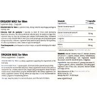 ORGASM MAX for Men to suplement diety, którego składniki wspomagają wymagania męskiego ciała. Zawarte w preparacie składniki przyczyniają się do utrzymania prawidłowego ciśnienia krwi, pomagają pobudzić pożądanie seksualne i działają afrodyzjakalnie. Co więcej, preparat poprawia wydolność organizmu, wspiera witalność i wytrzymałość fizyczną oraz wpływa na ożywienie. Dodatkowo zawarte w preparacie składniki pomagają w utrzymaniu prawidłowej erekcji oraz biorą udział w spermatogenezie.